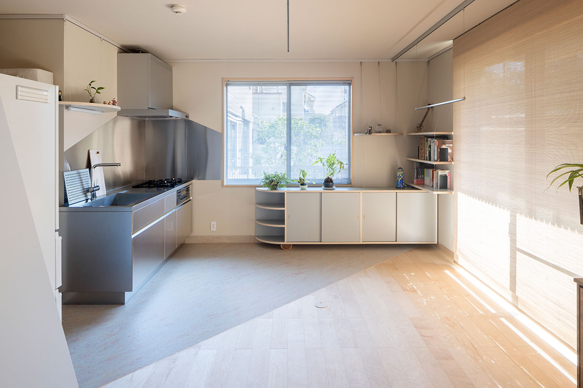 The house is located in a quiet residential area in Tokyo. The renovation project involved connecting two rooms on the first floor and converting them into a single room of about 40 m2 with a kitchen, dining space and a bedroom.