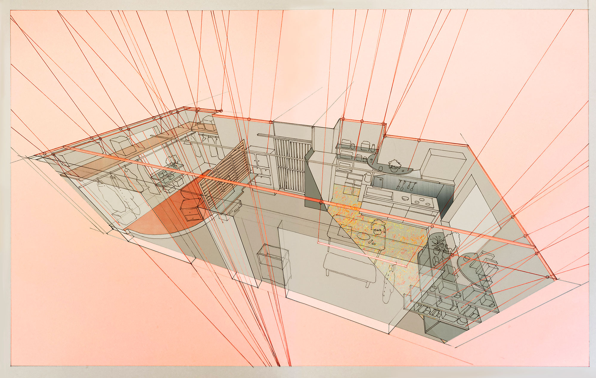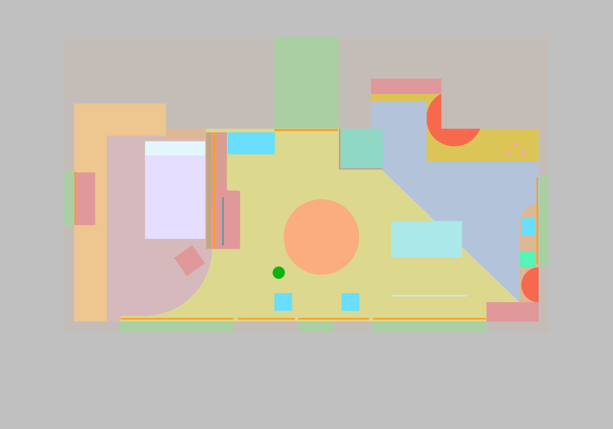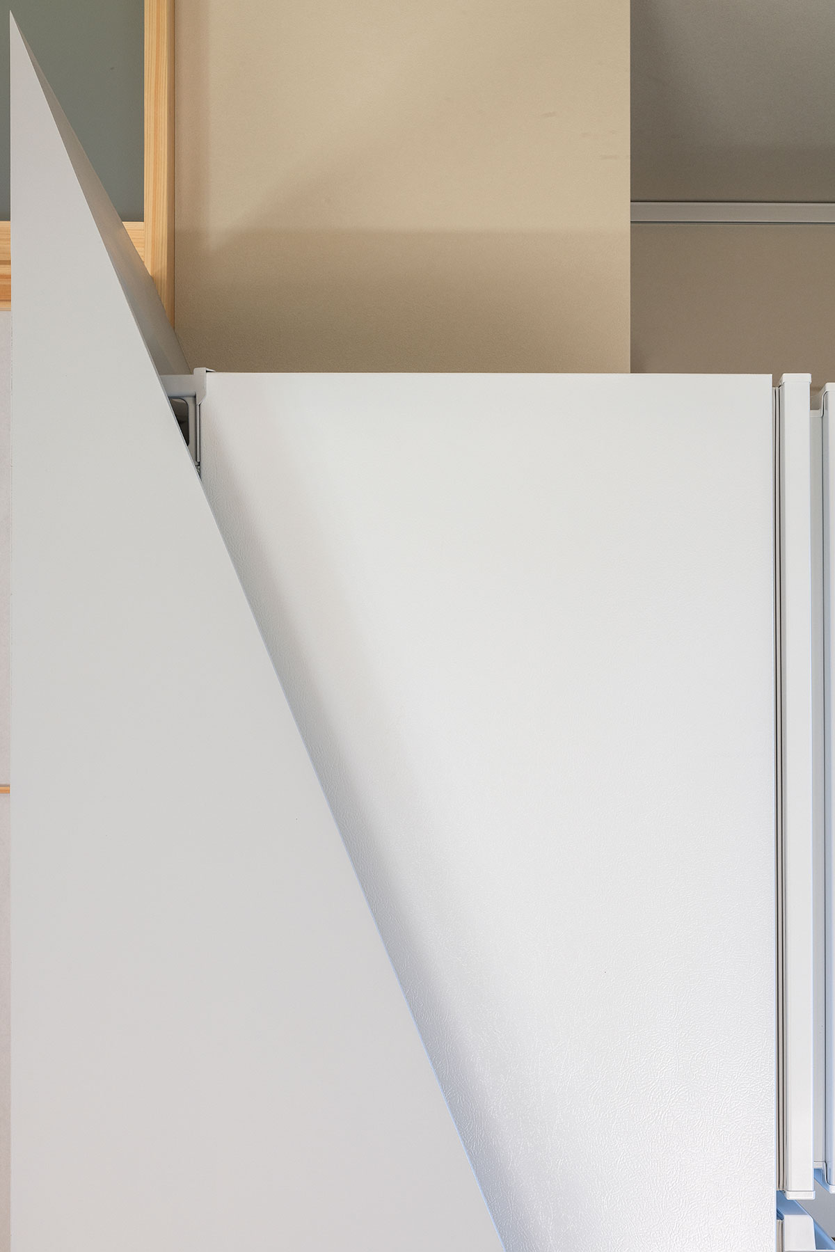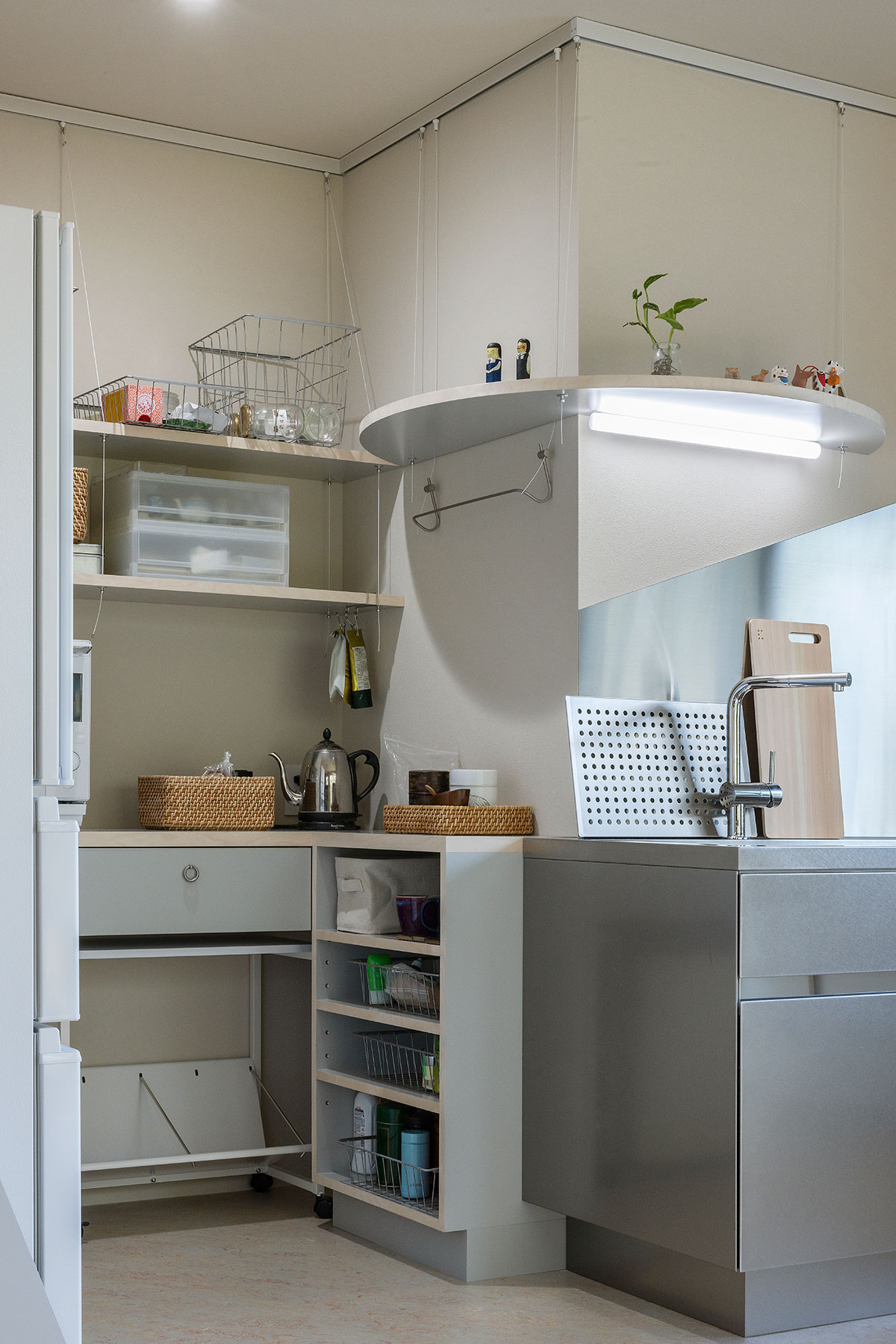 生活の変化に応じて、吊られた建築エレメントは、金具の位置を変えることができ、長期的・機能的な柔軟性がある。同時に、吊られている、という軽やかなエレメントが織りなす空間は、定着されていない浮遊感が漂う、揺らぎのある部屋である。