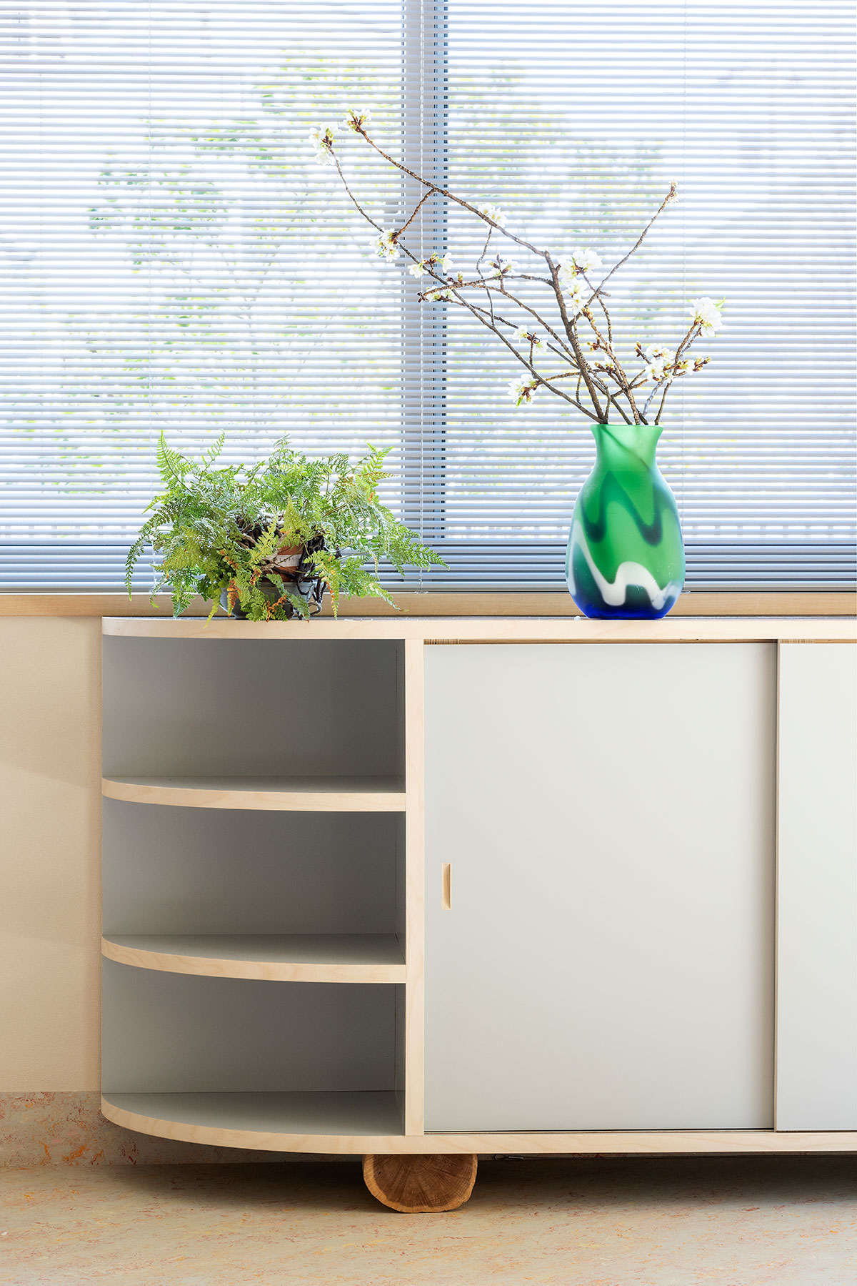 The closet also hangs from the ceiling. The highly translucent curtains reflect the silhouettes of the clothes hanging behind them, but there are no posts or receiving brackets for the hanger pipe. The cupboard rests on a log inserted between it and the floor that serves as a fulcrum, and the other end is suspended with wires. There is a 100 mm gap between the floor and the cupboard. The blinds and curtains at the windows all hang from the ceiling. In this manner, all elements are not “fixed” to the floor or walls but only “in contact” with them.