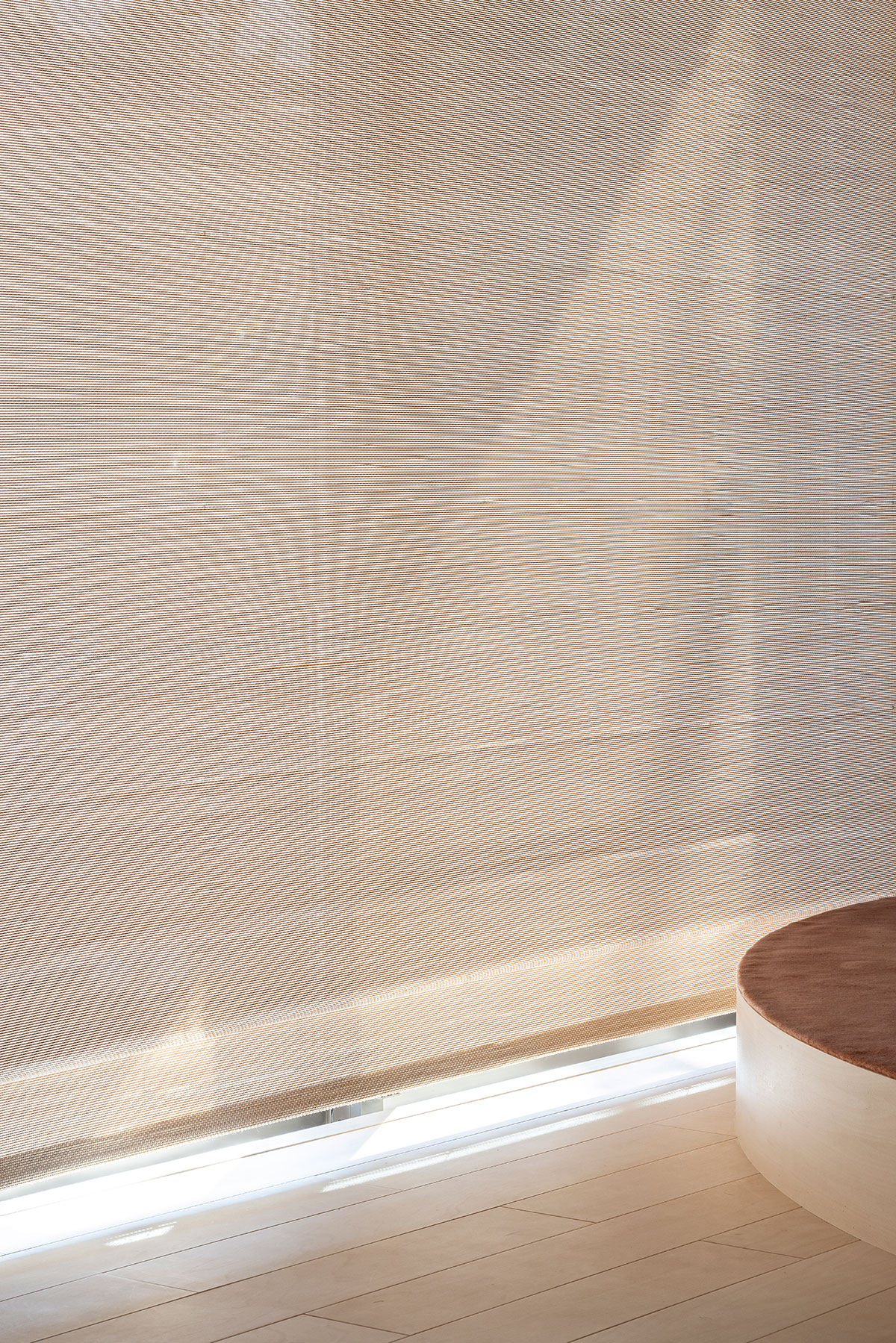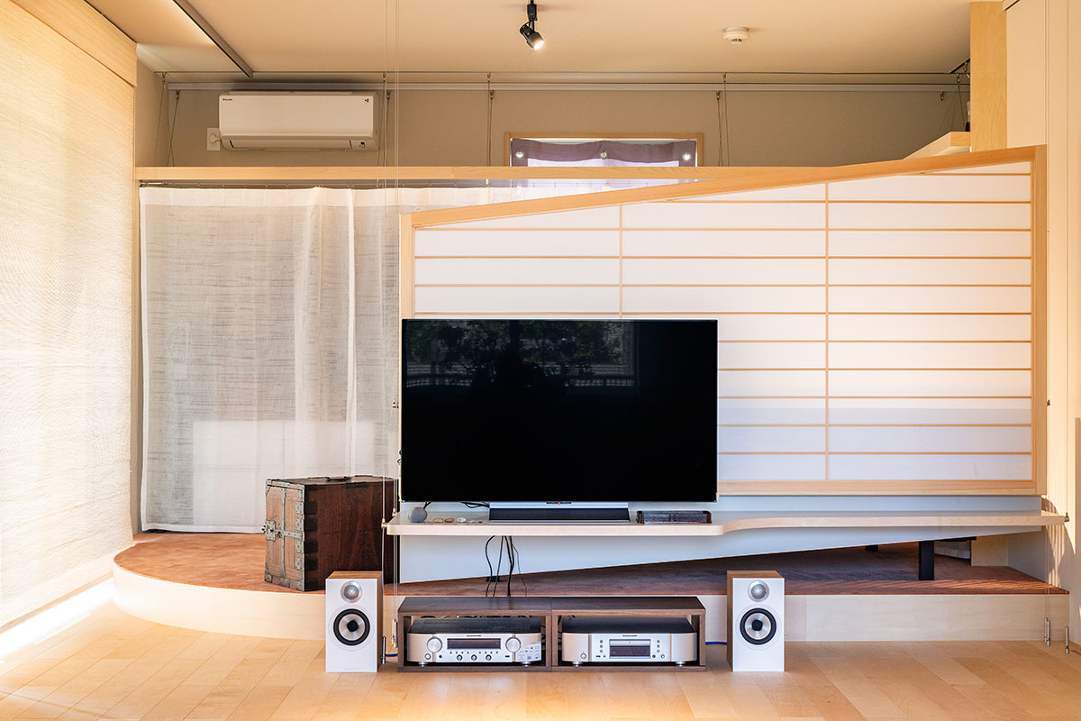 Three walls of the room have windows that open onto the neighbor’s garden and a well-kept Japanese-style garden. Beautiful natural light also enters during certain hours of the day. For this location, we considered a light, floating architectural setting that transmits the surrounding environment and is composed of elements that sometimes fluctuate and change. The fluctuating lightness of the interior gives a sense of freedom in life and visually connects the room to the attractive gardens.