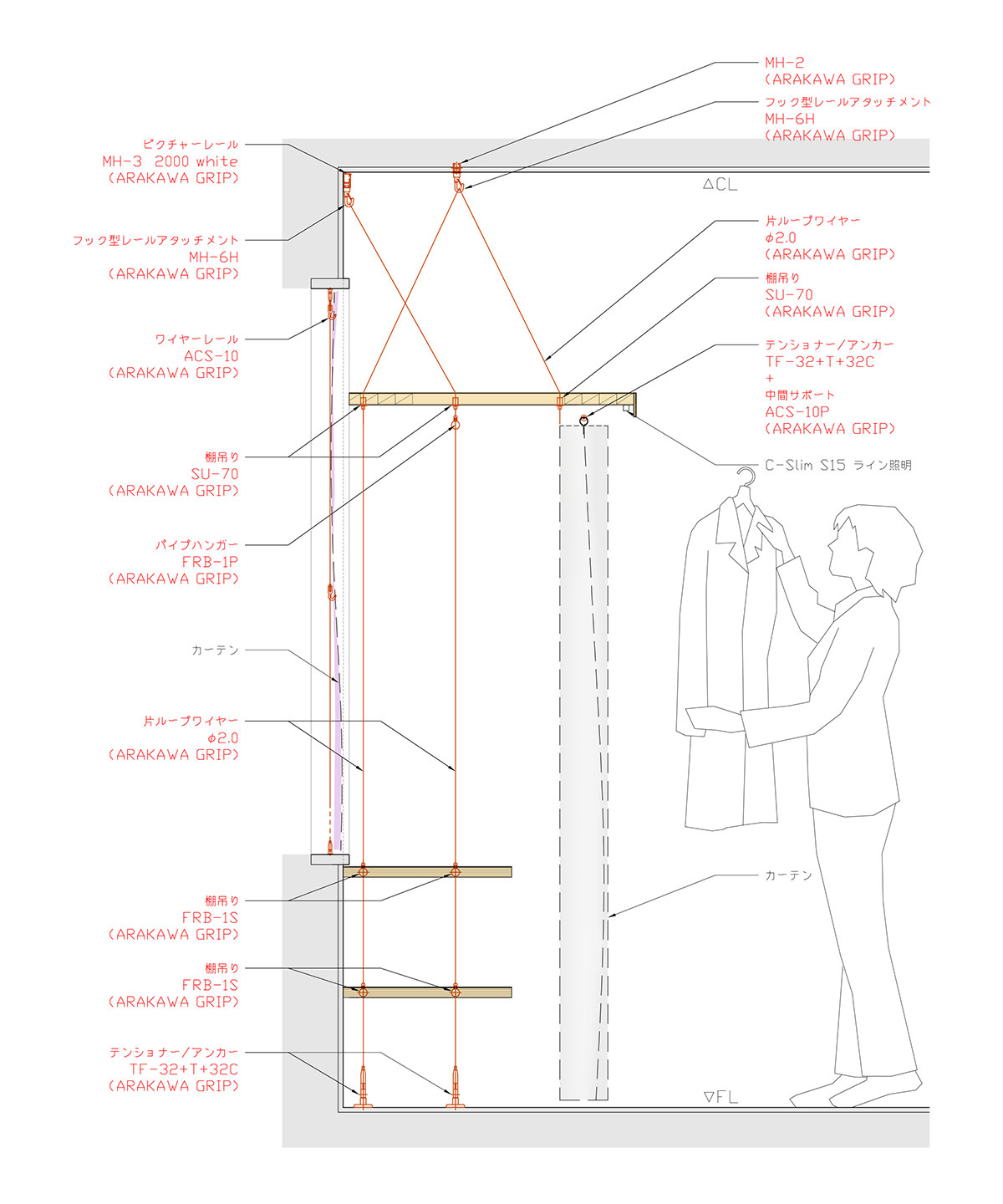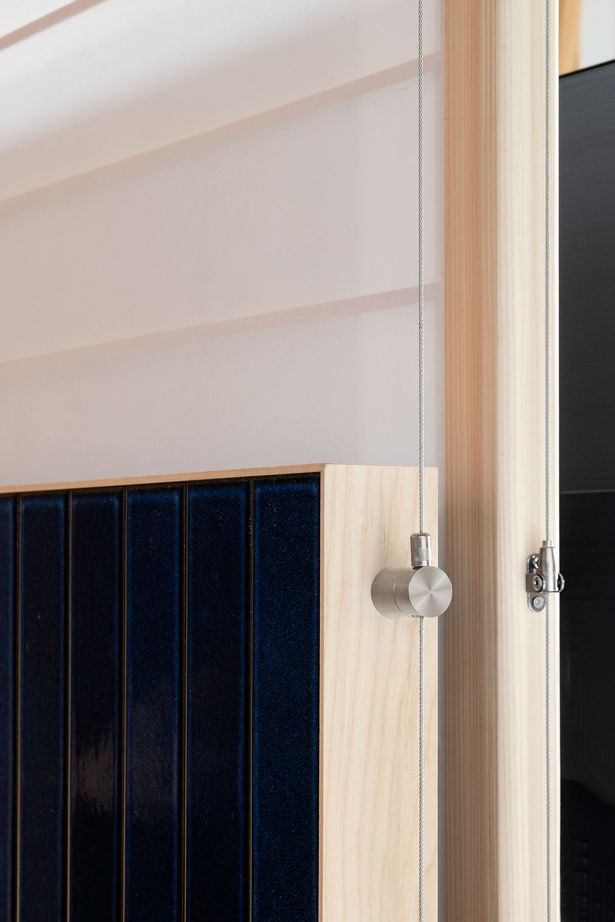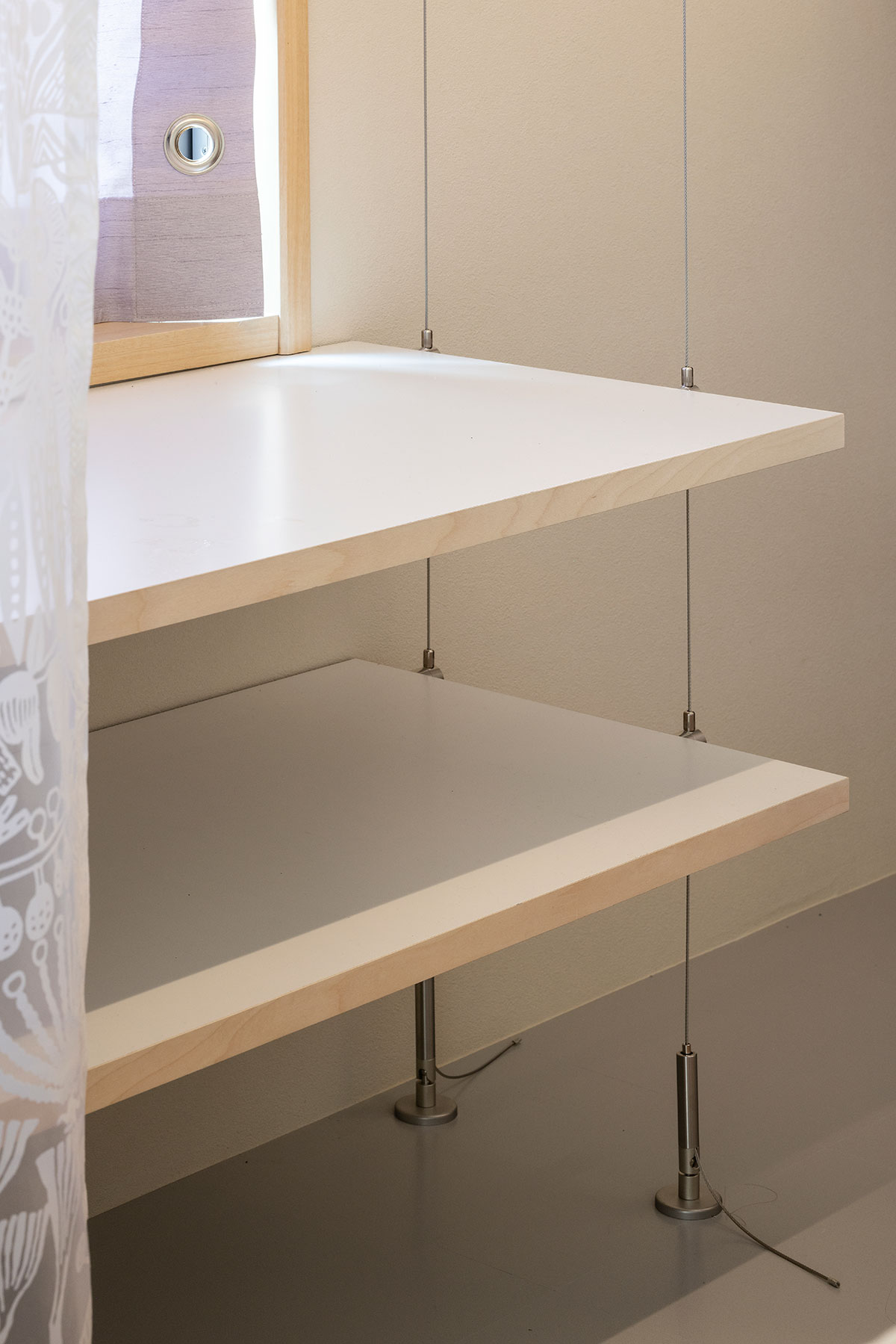 棚板は、通常であれば壁に控えをとり、しっかりと固定できるが、ここでは、天井からワイヤーで吊るされている。棚受け金具はなく、代わりに棚板は複数本のワイヤーで天井からぶら下がっている。パーティションも天井と床に張られたワイヤーによって宙に浮く。ピンと張ったワイヤーによってしっかりと固定されているが、ちょっと手で触れたり、風を受けると、ブルブルっと振動して、そしてまた元の定位置に戻る。