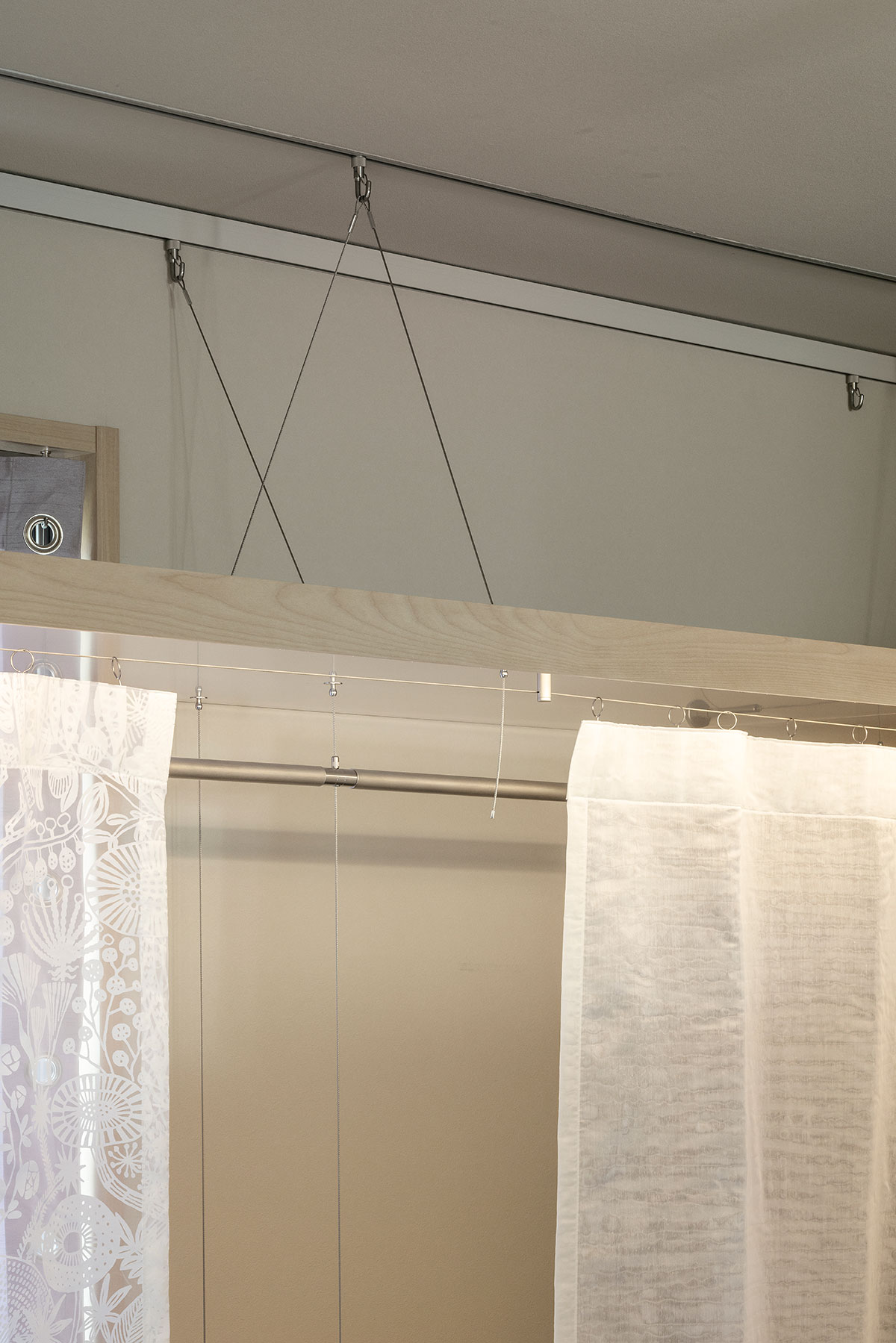 The position of the metal fittings of the suspended architectural elements can be changed according to changes in life, allowing for long-term and functional flexibility. At the same time, the space in which the suspended, light elements are woven together constitutes a fluctuating room with a floating feeling that is not fixed in place.